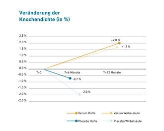 Die DEXA-Messung nach sechs Monaten zeigte, dass die Teilnehmer der Verumgruppe (mit dem Studienprodukt) ihre Knochendichte in der Hüfte und der Wirbelsäule erhalten konnten, während dies den Teilnehmern der Placebogruppe nicht gelang. In der Placebogruppe reduzierte sich die Knochendichte in der Wirbelsäule nach sechs Monaten um –2 % und in der Hüfte um –0,7 %. Bei der DEXA-Messung nach zwölf Monaten zeigte sich in der Verumgruppe, dass die Wirbelsäulenknochendichte um durchschnittlich +1,7 % und die Hüftknochendichte um +2 % zunahm. Diese Ergebnisse belegen, dass eine gezielte, langfristige Zufuhr ausgewählter Nährstoffe einen wesentlichen Beitrag zur Erhaltung und Verbesserung der Knochendichte leisten kann.