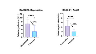 - Psychische Belastung (DASS-21): markante Abnahmen bei Depression (−57 %), Angst (−56 %) und Stress (−45 %)