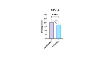 Die PSS-10 erfasst, wie belastend der Alltag in den letzten Wochen erlebt wurde – also nicht „objektiven“ Stress, sondern die individuelle Wahrnehmung von z. B. Unvorhersehbarkeit, Überforderung und Kontrollverlust. Sie umfasst zehn Aussagen, die von 0 („nie“) bis 4 („sehr oft“) bewertet werden; höhere Werte bedeuten mehr empfundenen Stress. Eine Reduktion um 15 % spricht dafür, dass sich die Teilnehmenden zum Studienende ruhiger, gelassener und handlungsfähiger fühlten.