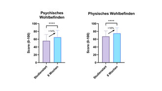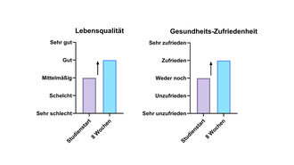 Parallel zur Abnahme des Stressempfindens und der psychischen Belastung verbesserte sich die Lebensqualität, erfasst mit dem WHOQOL-BREF. Das psychologische Wohlbefinden stieg um 14 %, das physische Wohlbefinden um 16 %. Insgesamt verschob sich die Selbsteinschätzung – sowohl bei der globalen Lebensqualität als auch bei der Zufriedenheit mit der eigenen Gesundheit – von „neutral“ zu „gut“.