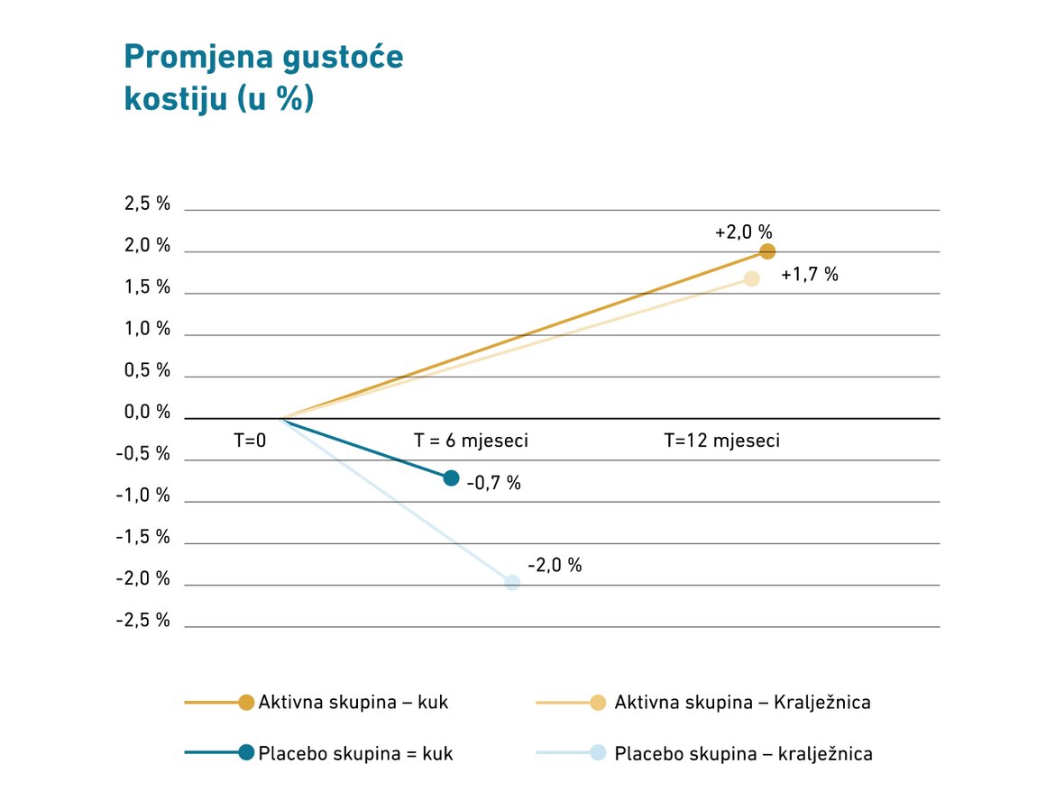 * Vlastita BIOGENA pilot-studija: Nakon 12 mjeseci svakodnevnog uzimanja Osteo Calbon Komplex® Gold, zabilježeno je prosječno povećanje gustoće kostiju u kuku (+2 %) i kralježnici (+1,7 %).