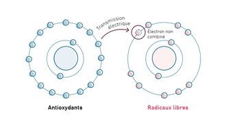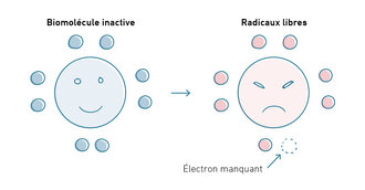Les radicaux libres font partie de notre vie comme l’air que nous respirons. Derrière ce terme aérien se cachent des atomes et molécules particulièrement réactives auxquelles il manque au moins un électro du point de vue chimique. Ce défaut rend non seulement les radicaux libres déséquilibrés, il les rend également particulièrement agressifs. Pour être à nouveau «complets», ils arrachent un électron au premier partenaire réactif disponible. Ainsi, l’atome volé devient lui aussi un radical libre et se procure l’électron manquant en se servant dans son environnement. Pour que cette procédure ne se transforme pas en une réaction en chaîne illimitée, le corps contrôle les radicaux libres à l’aide des pièges à radicaux libres.